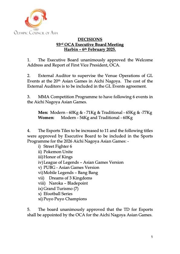 委員會還一致決定解散由OCA任命的、負責確定2026年愛知名古屋亞洲運動會電子競技項目的工作組(Task Force),因為電子競技項目已由OCA執(zhí)行委員會批準。